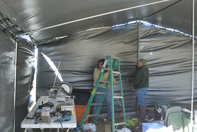 The big top tent worked out great even though we didn't get all of the walls up it did help block some wind and kept our tools out and away from the elements...we did have some serious wind a couple of days that caused me some concerns about whether or not this thing would be able to withstand but other than a few bent poles...no problem! |
