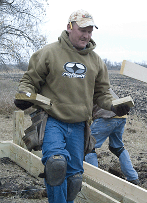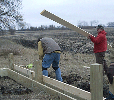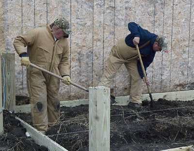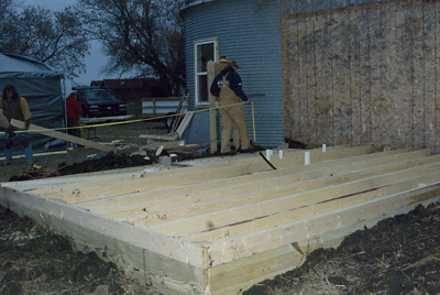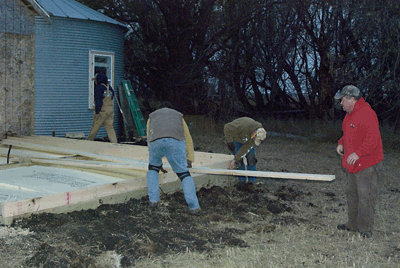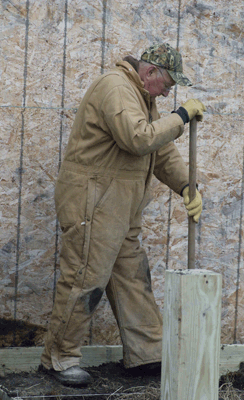 Kelly Smeltzer and his tractor arrived Friday and we put the drill on and got after the "awfullist job in the world"...digging post holes. It sure was a big help and seriously can't thank Kelly enough for his help...and also while were are talking about the Smeltzers...Forrest and Jackie were kind enough again to allow us "Water Rights" as we borrowed at least 300 gallons this trip for showers and cleaning up Digging was tough with the clay that is just below about 18" of good old black dirt...of course it stuck real good to the bottoms of our boots and also the post hole diggers but we got the job done and by Saturday about noon we had all 9 posts set in concrete and ready for the floor supports...that's about the same time that Steve and Larry arrived since taking off from home in Indiana after work on Friday and they had already set a goal of having the floor on and ready for a dance before bed. . |