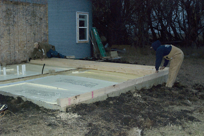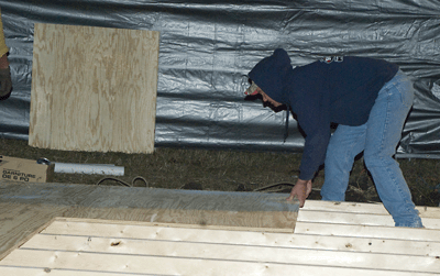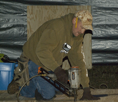 | We all kept working on the floor until supper and then got back on it afterwards and under the flood lights we finished up and no body had much left to give so we decided to call it a day...and what a good one it was...Steve and Larry after working all day at home in Indiana on Friday....driving through the night to get up here sometime around noon on Saturday and then working the rest of the day on this portion of the project should have just passed out with exhaustion however...there was plenty of laughter coming from the bunk room hours after the lights went out. | |||||||||||||||||||||||||||||||||||||||||||||||||||||||||