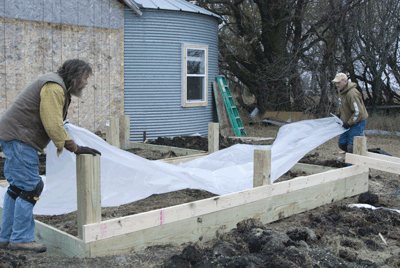 Before the floor joist went into place we put some plastic down and also some styrofoam insulation board...that's Steve and me here in this photo. |