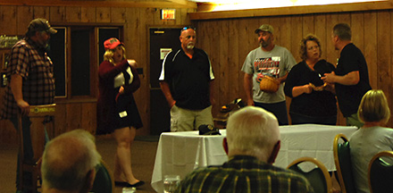 | Here's a picture of the drawing...Rob Hare stood watch over the prizes, McKenzie called out the winning numbers, Jon and Bill were there and Tam hands Steve his prize....this went on until all of the prizes were awarded...of course! | ||||||||||||||||||||||||||||||||||||||||||||||||||||||||||||||||||||||||||||||||||||||||||||||