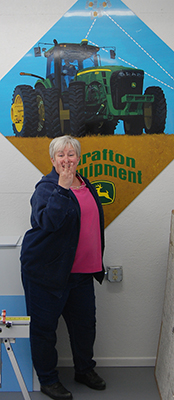 | Okay...we took off, I think it was Thursday afternoon about 3:00 May 22nd. Visited some friends around Delavan, Wisconsin and then spent the night somewhere on the west side of St. Paul, Minnesota. Up early Friday morning and headed north of Grand Forks to Grafton. Met our attorney, Nick Hall, and his wife there at their office and also found a friend signpainter whom we hadn't seen for quite a spell that just so happens to have a sign shop in that very same town. Ann McCain showed us about her shop and then reluctantly posed in front of a hand painted sign / illustration that she had done awhile ago...very, very nice work. |