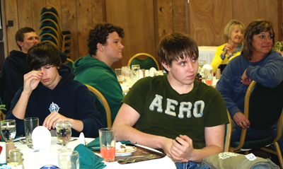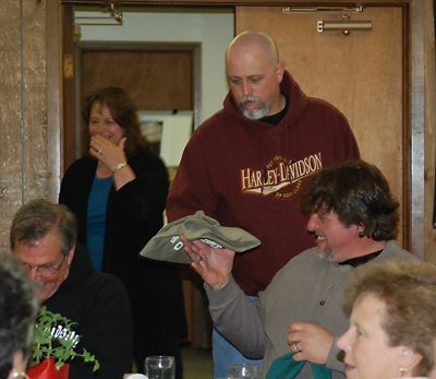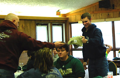 | After the meal it was time to hand out some awards. This year everyone who had made the trip up and back (2,000) was awarded the (how many miles they had traveled up and back) "MILE CLUB" tshirts. Here's Jon handing Brandon's 2,000 mile club shirt. |