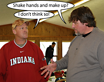 | A couple of birthdays to note here. Jack Rhodes (left, Vince's dad) turned 82 the day of the banquet of all things and yes...there was a birthday cake! My dad (Doyle, center) celebrated his 80th birthday April 13th. And of course that's me (on the right) giving Jack a hard time! |