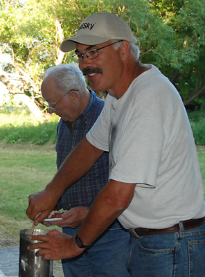 The Bar-B-Que went quite well we think...Susie started cooking at 8:00am and didn't turn the oven off until 7:00pm...it took that long to get everything cooked up...pulled pork sandwiches, potato salad, pasta salad, cheese potatoes, baked beans and deviled eggs as best as I can remember now....2 cakes and 2 pies (Norske Nook) from Wisconsin...and Delbert's home made ice cream.... |