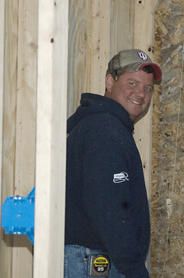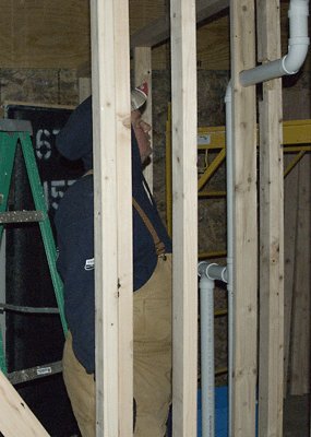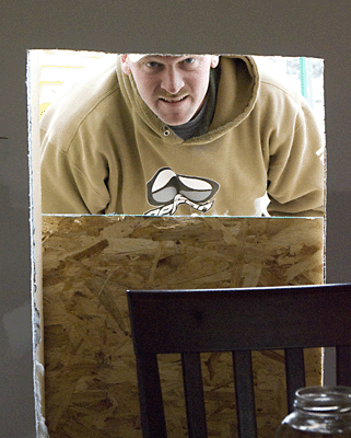 | The door ... that separates the kitchen from the newly built North Wing is about to be installed but not before some drywall and sub siding is removed by Steve shown here peering in from the other side. | |||||||||||||||||||||||||||||||||||||||||||