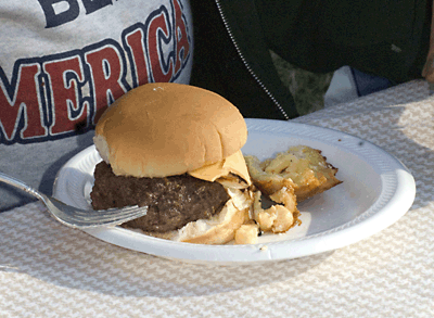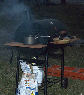 Here's Ralph getting ready to eat the "BIG BURGER"...just one more Pepsi please... and to the right is a picture of the charcoal grill that Farls and Garry assembled last September. |