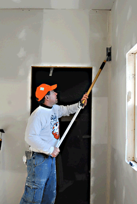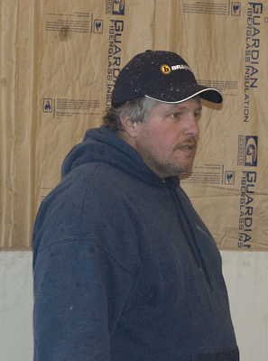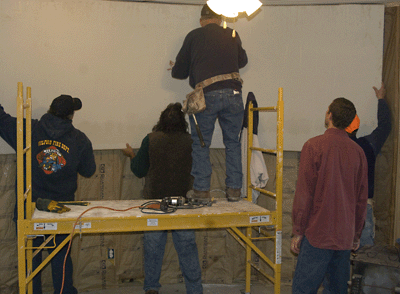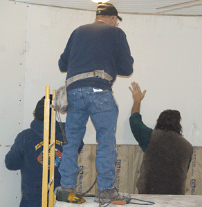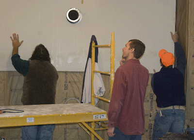 | Another action shot of us hanging drywall...actually..it was dampwall... |