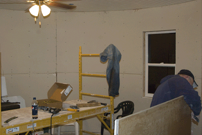 | October 29th...it was raining when the second crew arrived (Rob, Dalton, Jake, Vince, Austin and Ralph....they like the first crew had left in the late afternoon and driven through the night and half the day Thursday...and like the first crew...they just dove in to the tasks at hand...the rain was a blessing as the drywall was outside and the little bit of soaking that each sheet would receive from the showers made the sheets more flexible for the bending and with Vince's knowledge and understanding of the sheetrock and Ralph's hustling with the screw gun and a few of us helping to put each sheet in place well...it wasn't long before we had to move things out of the kitchen area so they could put the ceiling up...and that all was accomplished before supper that night....whew...once again |