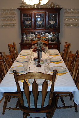 | We took Jon to the airport in Devils Lake on Tuesday afternoon so he missed out on a great dinner at Ron and Edair Tuebners home with their son Jeff and his wife Kathy and their daughter. I am sorry that I did not get any more pictures other than the one here of the table setting however we did have a great meal and then a good visit in the living room afterwards. | |||||||||||||||||||||||||||||||||||||||||||||||||||||||||||